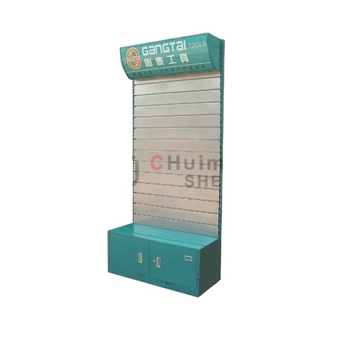 โลหะ Slatwall ร้านค้าปลีกอุปกรณ์เสริมชั้นวางจอแสดงผลที่มีตู้ฮาร์ดแวร์ร้าน Slat ผนังเครื่องมือยืนแสดงที่มีไฟ Led